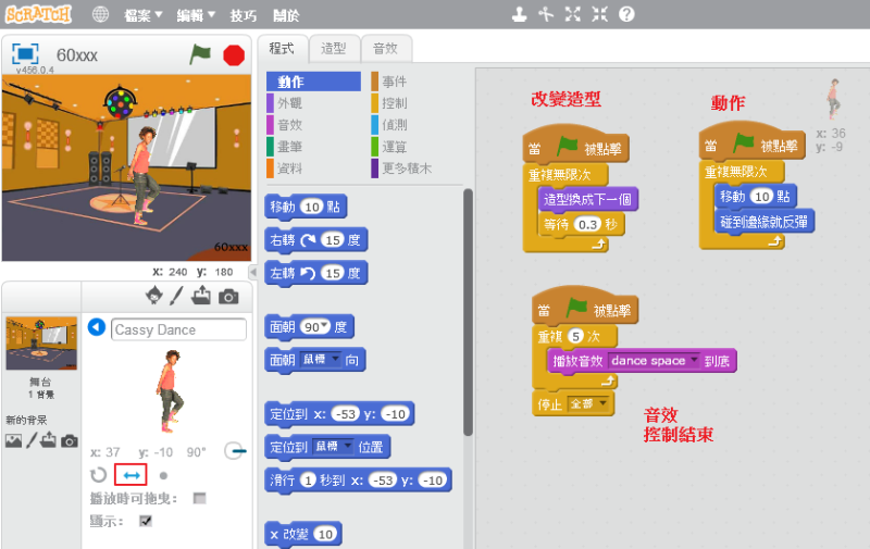 • 音樂,隨著音樂起舞,程式碼位置可以在角色或背景處,音樂結束要停止程式