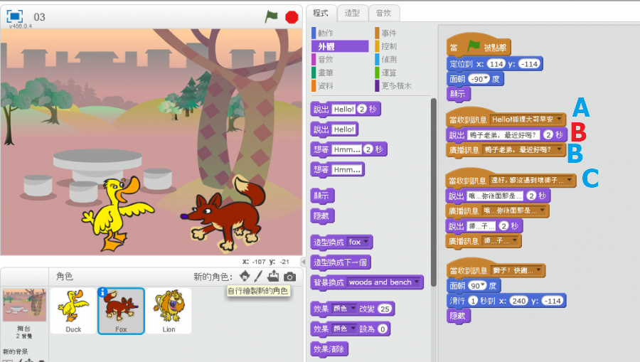 課程:五上程式語言教學:03鴨子與狐狸對話