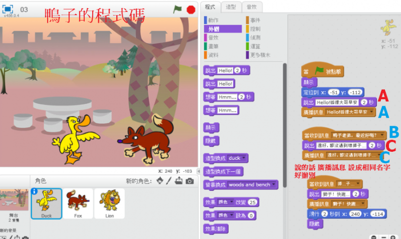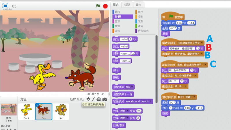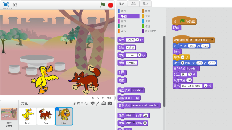 顯示原始碼舊版反向連結回到頁頂 Share via Share via... Twitter LinkedIn Facebook Pinterest Telegram WhatsApp Yammer Reddit Teams最近更新Send via e-MailPrintPermalink × 目錄表 03鴨子與狐狸對話 主題要求 實作 這是本文件的舊版! 03鴨子與狐狸對話 簡易的動畫故事 學習「廣播」與「接收」積木 主題要求 背景 班級座號 選取兩個主角及獅子 二個主角要對話 各講二句以上的話 獅子出現,鴨子與狐狸就一起跑了 實作 課程/五上程式語言教學/03鴨子與狐狸對話.1506054116.txt.gz 上一次變更: 2017/09/22 12:21由 admin