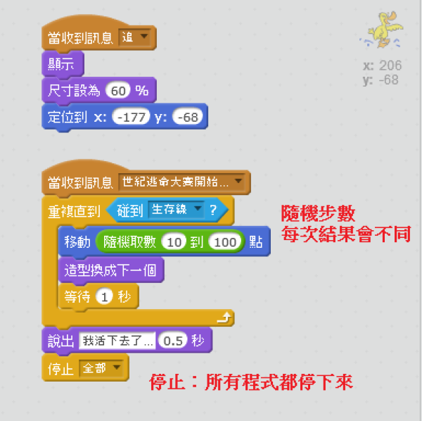 4.鴨子的程式碼,隨機步數的設定,停止全部,增加造型