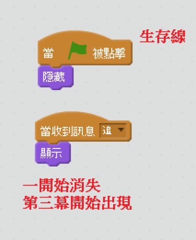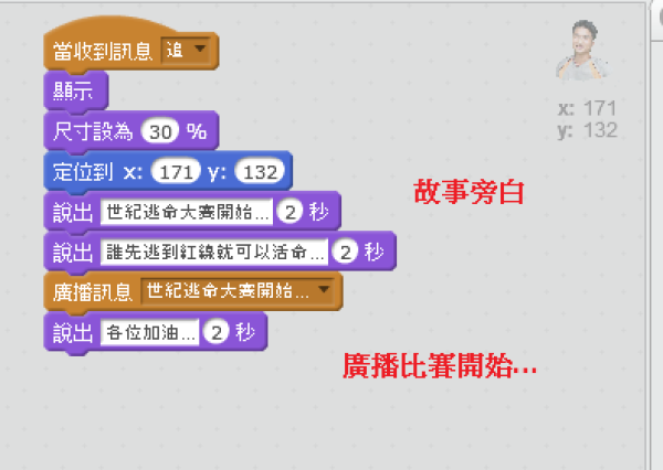 - 第三場景,自己串場,讓比賽開始 世紀大逃亡開始了,誰先碰到生存線就可以活下去…