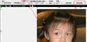 3. 調整筆刷大小將紅眼選取,可以將圖放大處理, 要多處理幾次,紅眼才會不明顯。