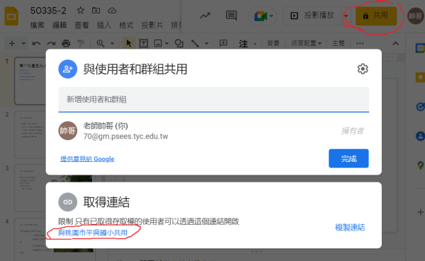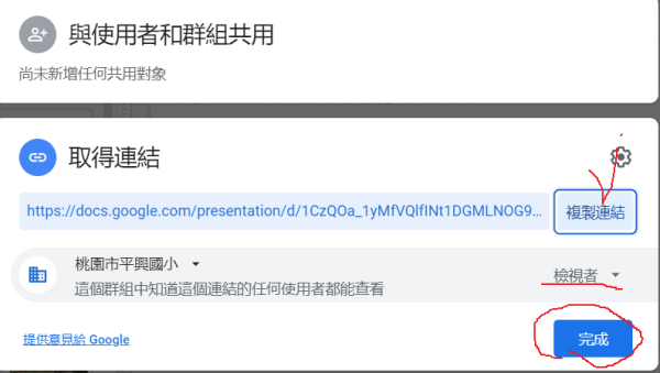 請在GOOGLE簡報作業頁面右上角「共用」處點選,最底下取得連結處改為「與桃園市平興國小」共用