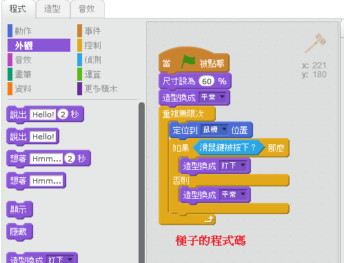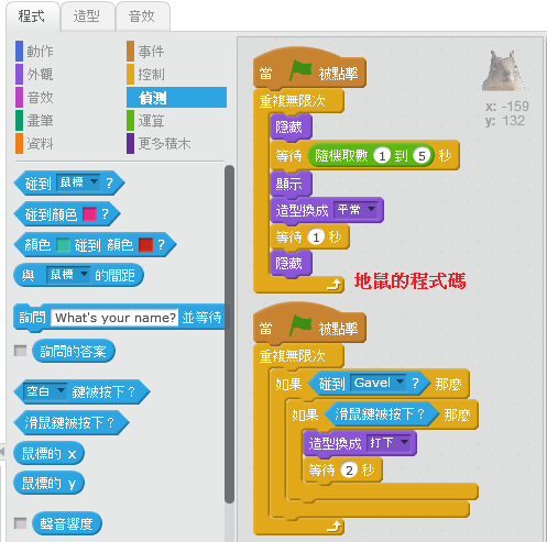 程式積木:如果否則、移到滑鼠游標、偵測按下