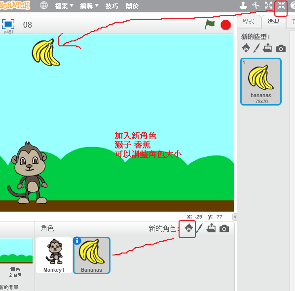 2、增加猴子、香蕉兩個角色,依狀況調整大小