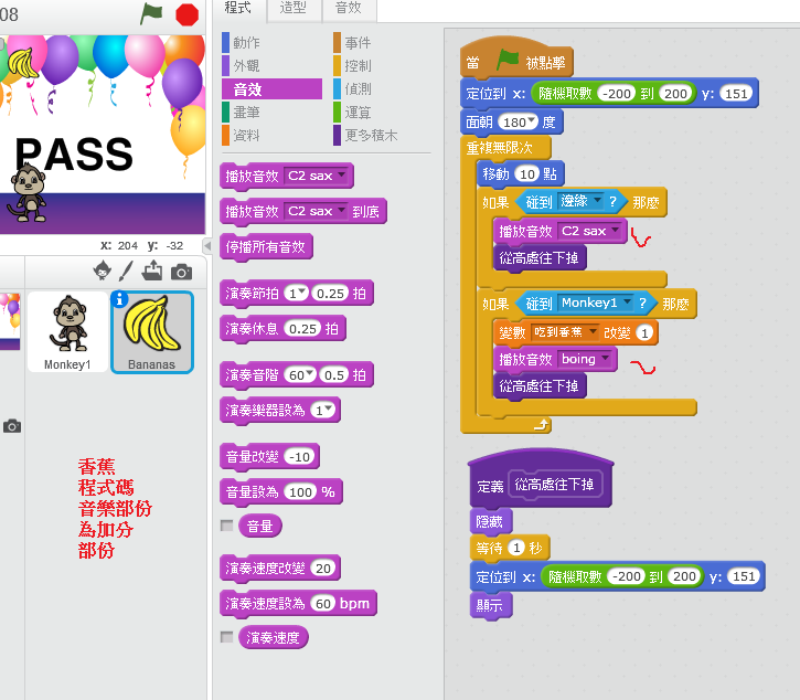 • 完成遊戲後記得要加入音樂:背景音樂、吃香蕉音樂、掉香蕉音樂!!!