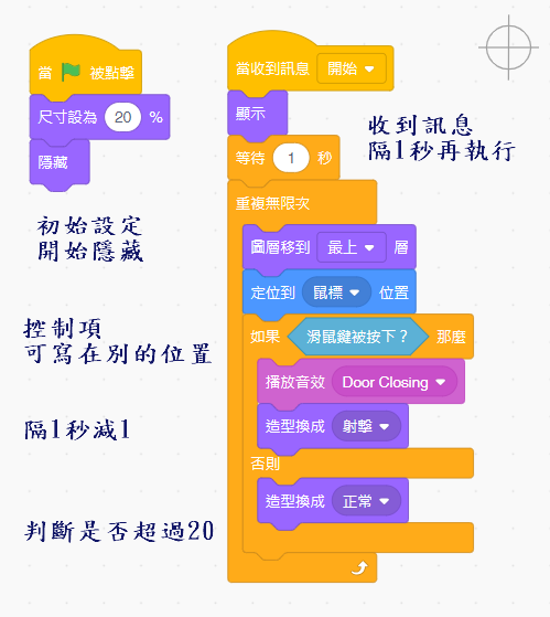 1、射擊音效、打到的音效、射錯扣分的音效→加在得分、失分變數改變的地方