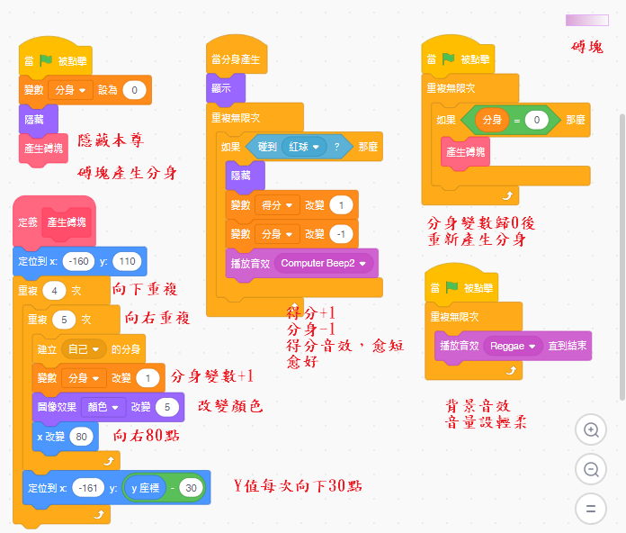 1、磗塊擊到音效→加在得分、失分變數改變的地方