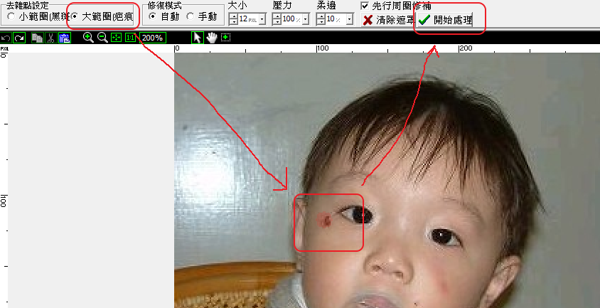 3.大範圍的疤痕:調整筆刷大小→選取→開始處理