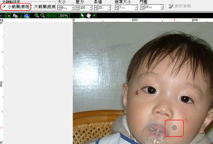 3. 調整筆刷大小將紅眼選取,可以將圖放大處理, 要多處理幾次,紅眼才會不明顯。